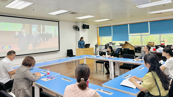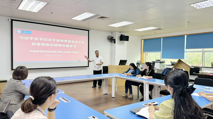 最后,吴莉莉老师带领大家全面学习贯彻习近平总书记关于宣传思想文化工作的重要论述。她结合专业教学与思政工作,分享如何在课堂教学与论文指导中教育学生拥有文化自信的成功经验。