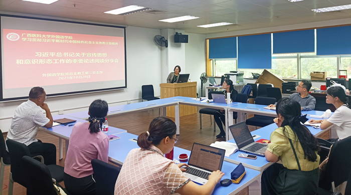 在会上,党总支韦建辉书记首先领学了习近平总书记关于宣传思想文化工作的重要指示。他强调全体党员应以高度的政治责任感和时代使命感深入学习贯彻习近平文化思想,深入落实“七个着力”要求,深入践行“明体达用、体用贯通”的方法。韦书记还强调充分发挥医学大学特色优势,坚持不懈用习近平新时代中国特色社会主义思想凝心铸魂,为推动文化繁荣、建设文化强国、建设中华民族现代文明作出贡献。