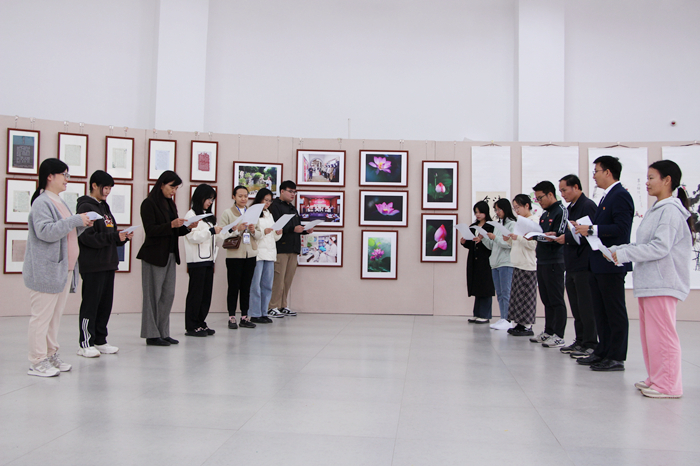 活动首先由武鸣校区管理中心常务副主任罗小玲教授作廉洁文化现场教学,深刻阐述了廉洁自律的重要性。全体同志认真聆听,接受清廉文化熏陶。随后,在杨勇老师的带领下参观了党建展示馆,其中的历史资料和展品让全体同志对中国共产党的发展历程及学校的发展历史有了更深入地了解。接着,师生一行移步到A7大学生活动中心,参观了廉洁书画作品展和勤廉榜样先进事迹展。一则则生动的廉洁书画作品和感人的事迹让党员们深刻感受到一身正气、两袖清风、廉洁自守的医大人风范,让全体同志在历史传承中感受到了廉洁文化的熏陶。这些展览不仅展示了艺术与廉政教育的结合,也激励学生要成为遵纪守法、品德高尚的新时代青年。活动最后,师生集体朗诵了《爱莲说》,寓意着对中国传统文化的传承和青年学子的志存高远。