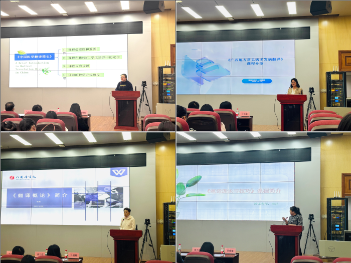 随后,翻译硕士专业课的任课教师就教学内容、课程安排及潜在合作方向进行了深入阐述。所设课程在覆盖专业核心知识的同时,充分结合广西的医疗资源、地域文化和民族特色,并融合具有地方特色的翻译实践。课程包括《翻译概论》《笔译理论与技巧》《广西地方常见病多发病翻译》等经典专业课,以及计划增设的《全球胜任力英语教程》,旨在系统提升学生的翻译能力与跨文化沟通素养。