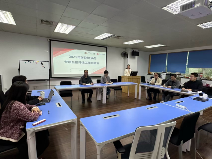 2025年翻译硕士学位授予点专项合格评估工作在即,2025年11月5日下午,91社区 在校本部综合楼304召开会议,布置迎评工作。学院党委书记韦建辉、院长曹治柳、副书记黄万获、副院长吕晓敏以及教研科、MTI教育中心、学生工作办公室人员参加会议,吕晓敏主持会议。