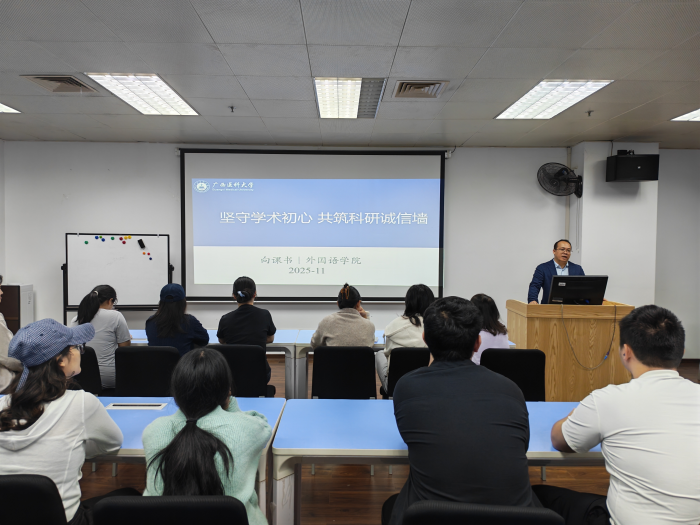 在交流分享环节,2024级翻译硕士研究生蒙贤玥同学、2025级翻译硕士研究生王子伦同学以“青年科研者的初心与使命”为切入点,阐述了学术规范对个人成长的意义,表示:“作为科研新人,我们需从第一堂课、第一篇论文做起,将诚信内化为习惯。”